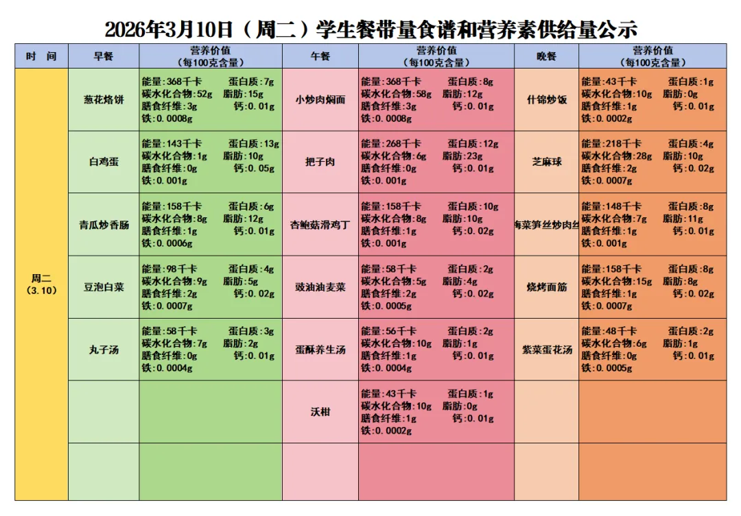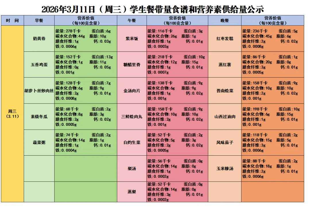 说明:上述为学生食谱营养餐量搭配情况。