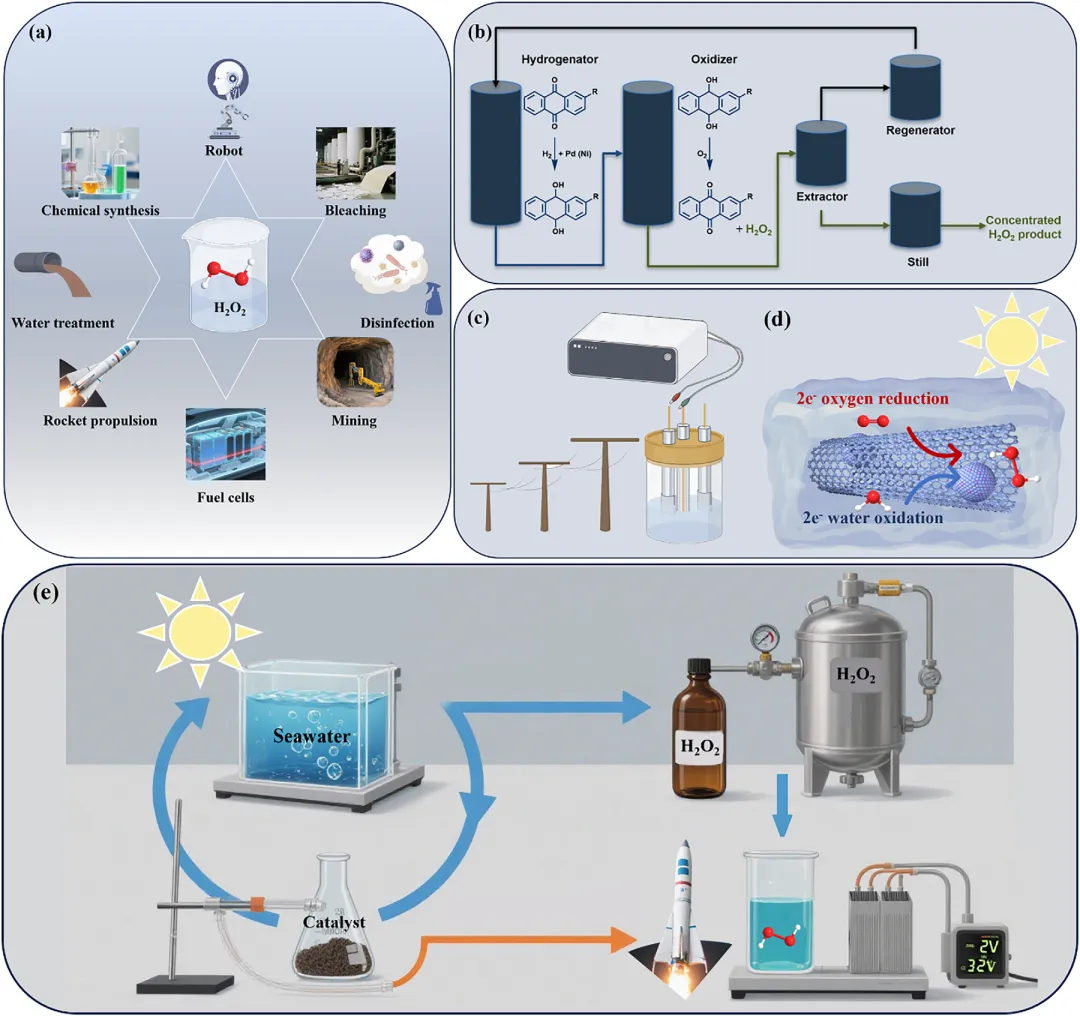 FIGURE 1 (a) Schematic diagram of the applications of H2O2 ; (b) the on-site H2O2 synthesis by anthraquinone method. Reproduced withpermission [10]. Copyright 2018 American Chemical Society; (c) electrocatalytic and (d) photocatalytic processes; (e) Schematic diagram of consecutiveconversion of solar energy to chemical energy and further to kinetic/electrical energy via photocatalytically generated H2O2 as green fuel carriers.