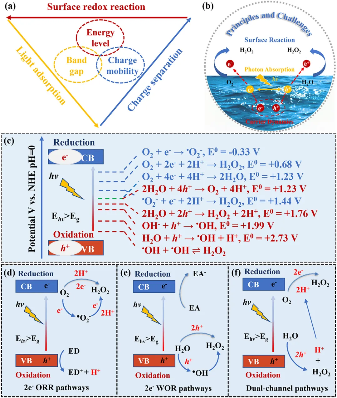 FIGURE 2 (a) The schematic overall structure of photocatalytic synthesis of H2O2 from seawater; (b) the correlation of key properties ofsemiconductors to their photocatalytic activities; (c) Energy diagram for O2 reduction and H2O oxidation on a semiconductor for H2O2 Production; (d)Photocatalytic ORR-pathway for the generation of H2O2 ; (e) Photocatalytic WOR-pathway for the generation of H2O2 ; (f) Photocatalytic dual-channelpathway for the generation of H2O2.