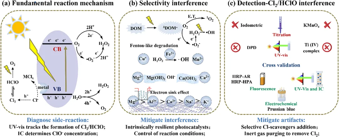 FIGURE 4 The schematic diagram of (a) key rate and transport descriptors of H2O2 generation alongside possible side-reaction pathways,including Cl− corrosion, chloride evolution reaction (ClER) and in situ hypochlorous acid generation; (b) the influence of dissolved organic matter(DOM) and various coexisting ions on the selectivity of H2O2 generation; (c) strategies for the selective detection of H2O2 and for mitigating hypochloriteinterference in colorimetric assays, in the presence of side reactions.