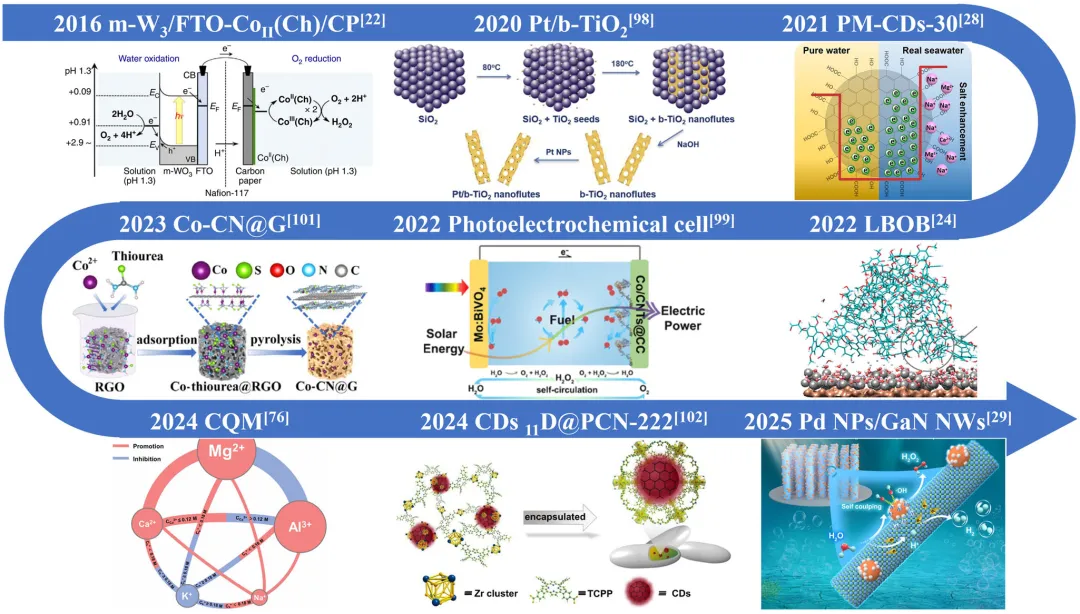 FIGURE 5 A brief timeline of the development of representative photocatalysts for photocatalytic H2O2 production from seawater.