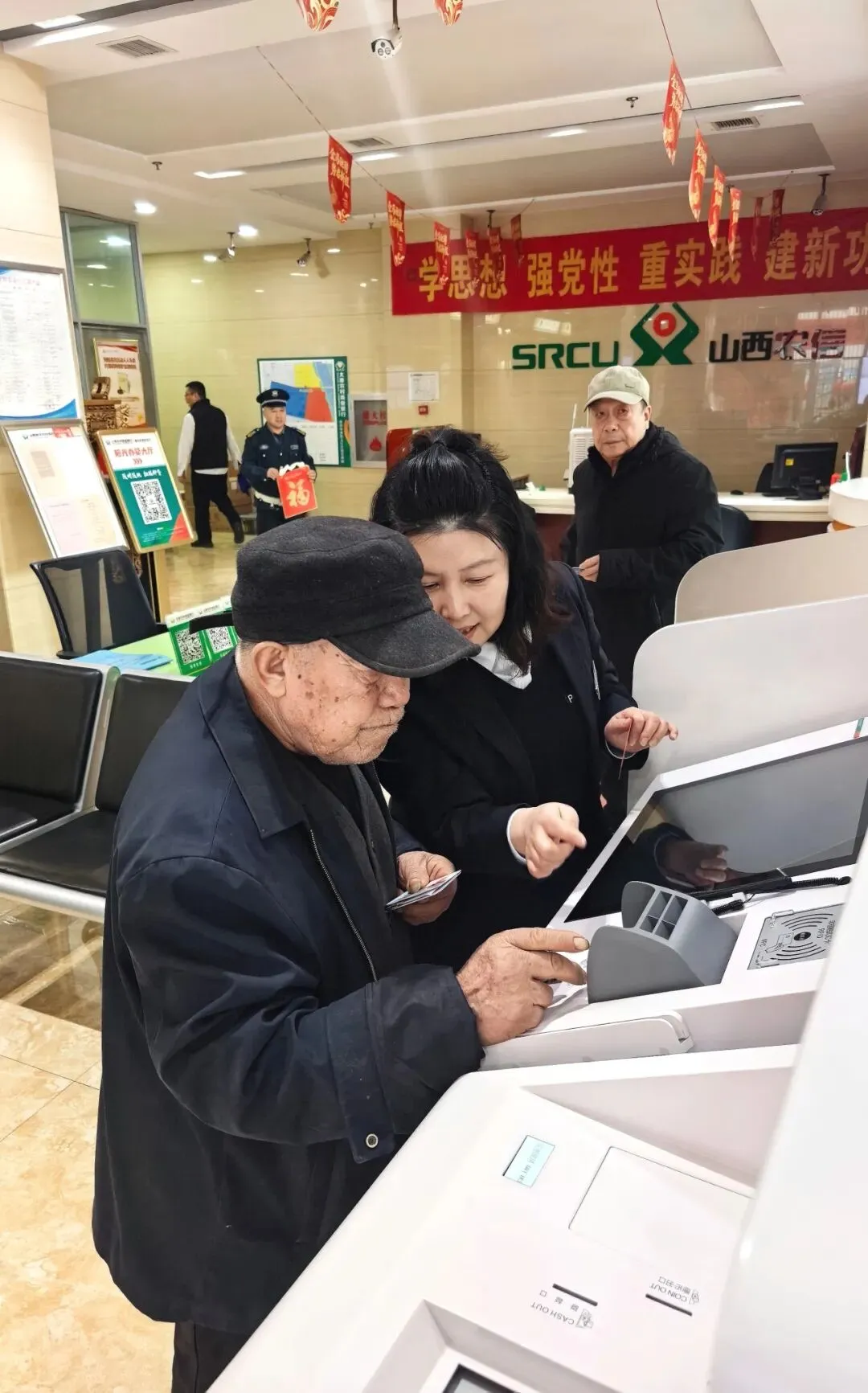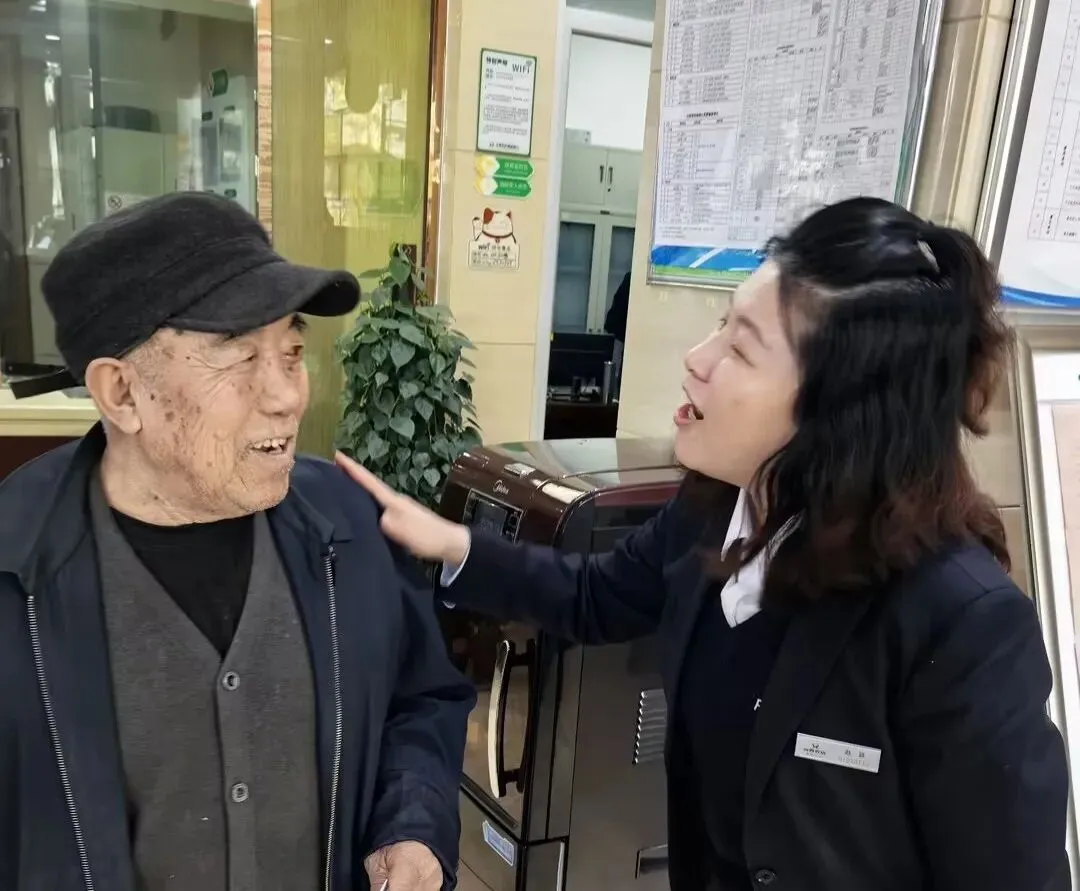 面对客流高峰,大堂经理提前预判,启动应急分流机制,引导年轻客户使用自助设备,重点服务老年群体。80岁的张大爷到店办理养老金转存业务,赵颖主动上前搀扶,协助其通过“爱心窗口”优先办理,全程仅用6分钟便完成业务。张大爷连连称赞:“以前排队得半小时,今天又快又贴心!”