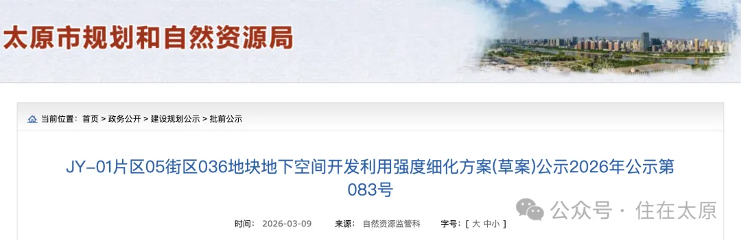 近日,3月9日,太原市规划和自然资源局发布了JY-01片区05街区036地块地下空间开发利用强度细化方案(草案)公示,该项地块即长风公园一期项目中的一部分。