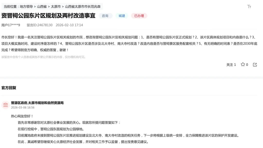 市长您好!我是一名关注晋祠公园东片区相关规划的市民,想咨询晋祠公园东片区相关规划问题: