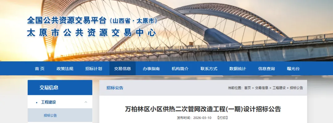 本招标项目划分为1个标段,本次招标为其中的万柏林区小区供热二次管网改造工程(一期)设计。招标范围为本次招标内容为本项目的初步设计、施工图设计及相关服务。(来源:晨报山西)