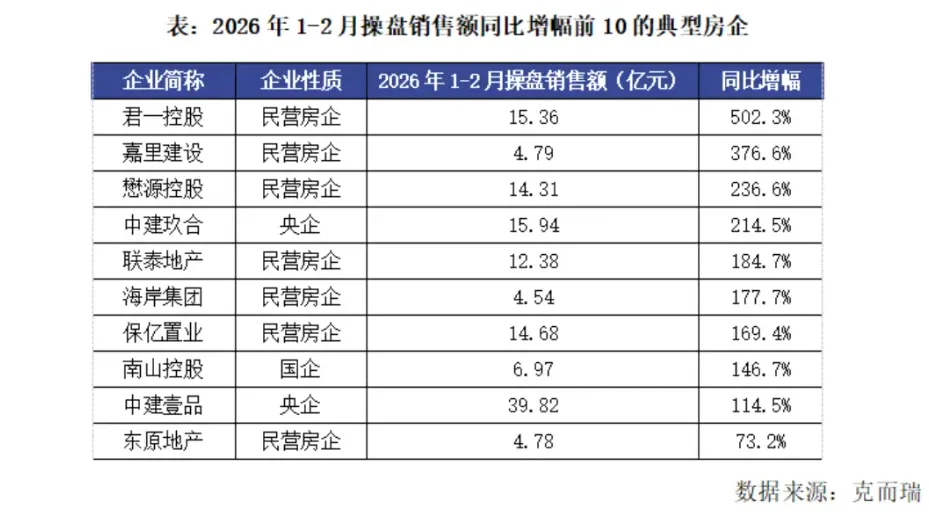 值得一提的是,2月部分企业业绩大幅回暖,同比增幅大于100%的企业数量有9家,其中,中建壹品业绩同比增幅达到了114.5%,这主要得益于其上海外滩元境项目单月贡献超18亿元,占总销售额近一半,其稀缺高端改善型产品在政策宽松与需求集中释放背景下实现“日光式”热销。
