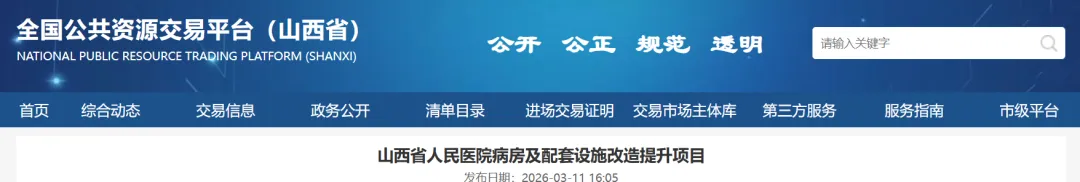 3月11日,山西省公共资源交易中心发布山西省人民医院病房及配套设施改造提升项目招标计划。项目总投资17802.08万元。