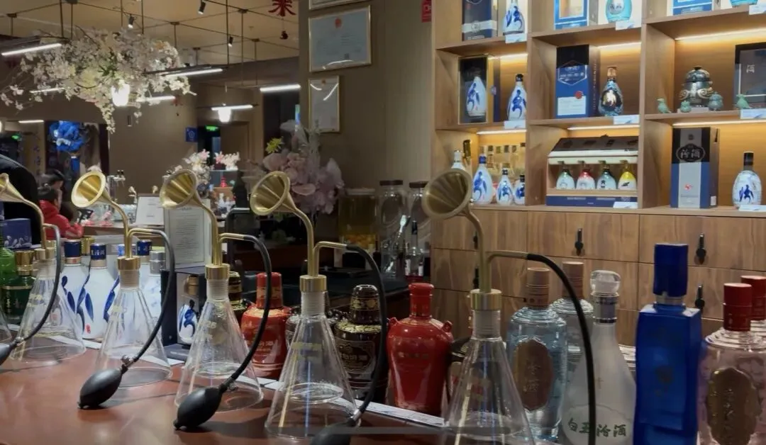 在他的引导下,我来到闻香品鉴区,通过特殊装置品闻了各种酒的香味。这个装置摆在那里就像化学实验室。用洗耳球把空气打进三角酒瓶里,通过气压把酒香打出来,把鼻子凑近喇叭形的出气口,就能闻到酒的香气。