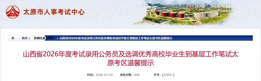 山西省2026年度考试录用公务员及选调优秀高校毕业生到基层工作笔试将于3月14日、15日举行,为方便太原考区考生顺利应试,特向您温馨提示: