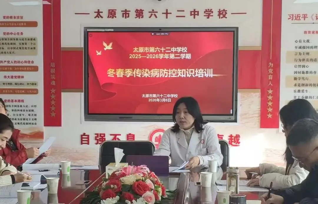 校医郝佳佳、韩丽霞开展冬春季传染病防控培训,针对流感、支原体肺炎等高发疾病,明确科学戴口罩、规范洗手、教室通风消毒等实操要求;通报各年级视力不良率变化,介绍学校延长课间、规范眼保健操等护眼举措;同时传达流感疫苗免费接种安排、太原市中小学脊柱与心理健康免费公益服务内容,要求班主任及时将健康福利告知家长。