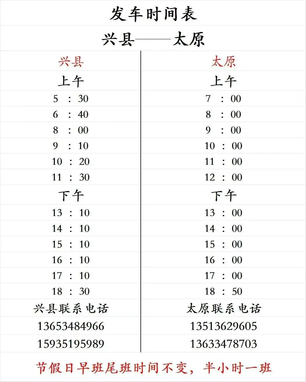 兴县→太原大巴,即日起继续实行票价优惠服务父老乡亲,早班5:50发车,末班18:30,中间一小时一班车!
