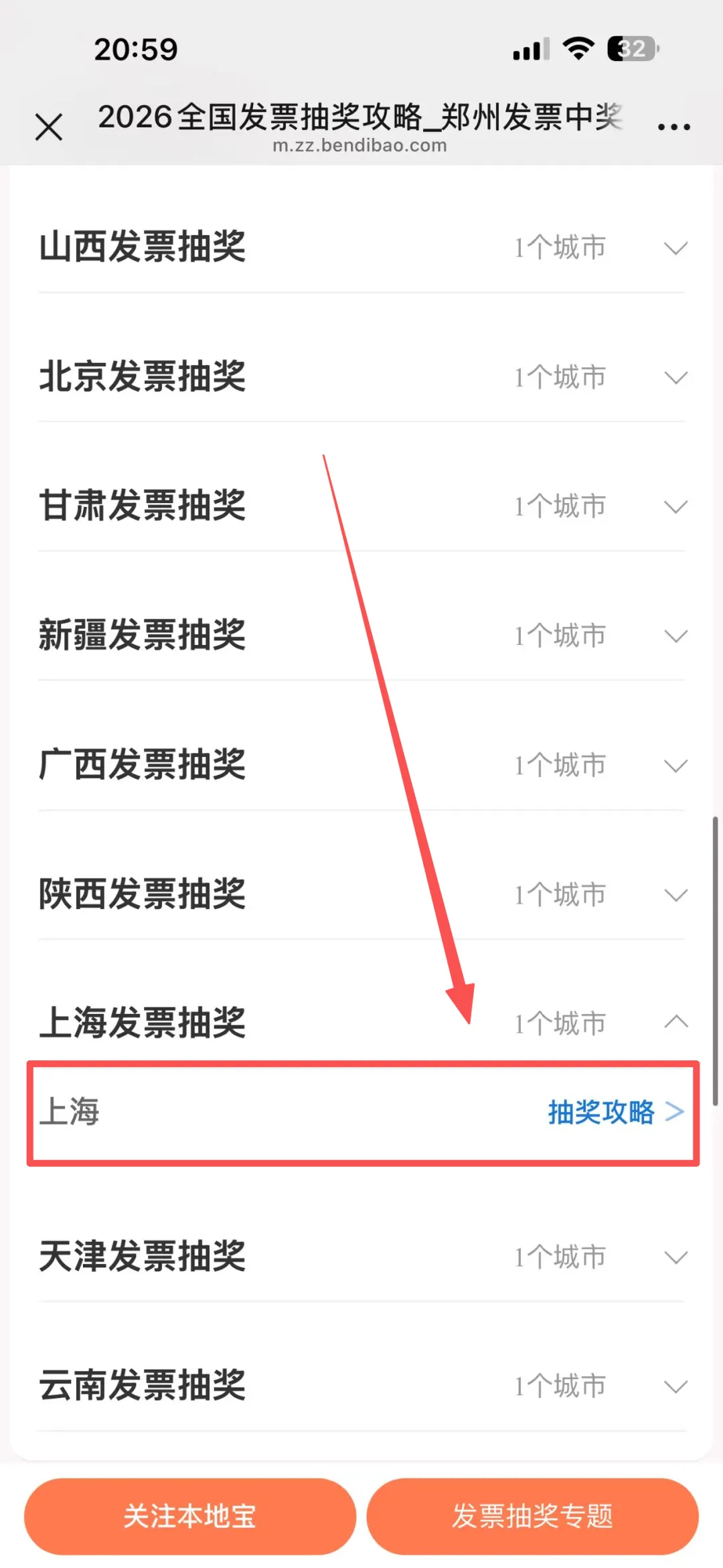 从上述入口进入全国发票抽奖工具后,下划找到对应城市。以上海为例,在上方可用看到上海抽奖入口、发票开具指南、中奖查询方法...一站式攻略
