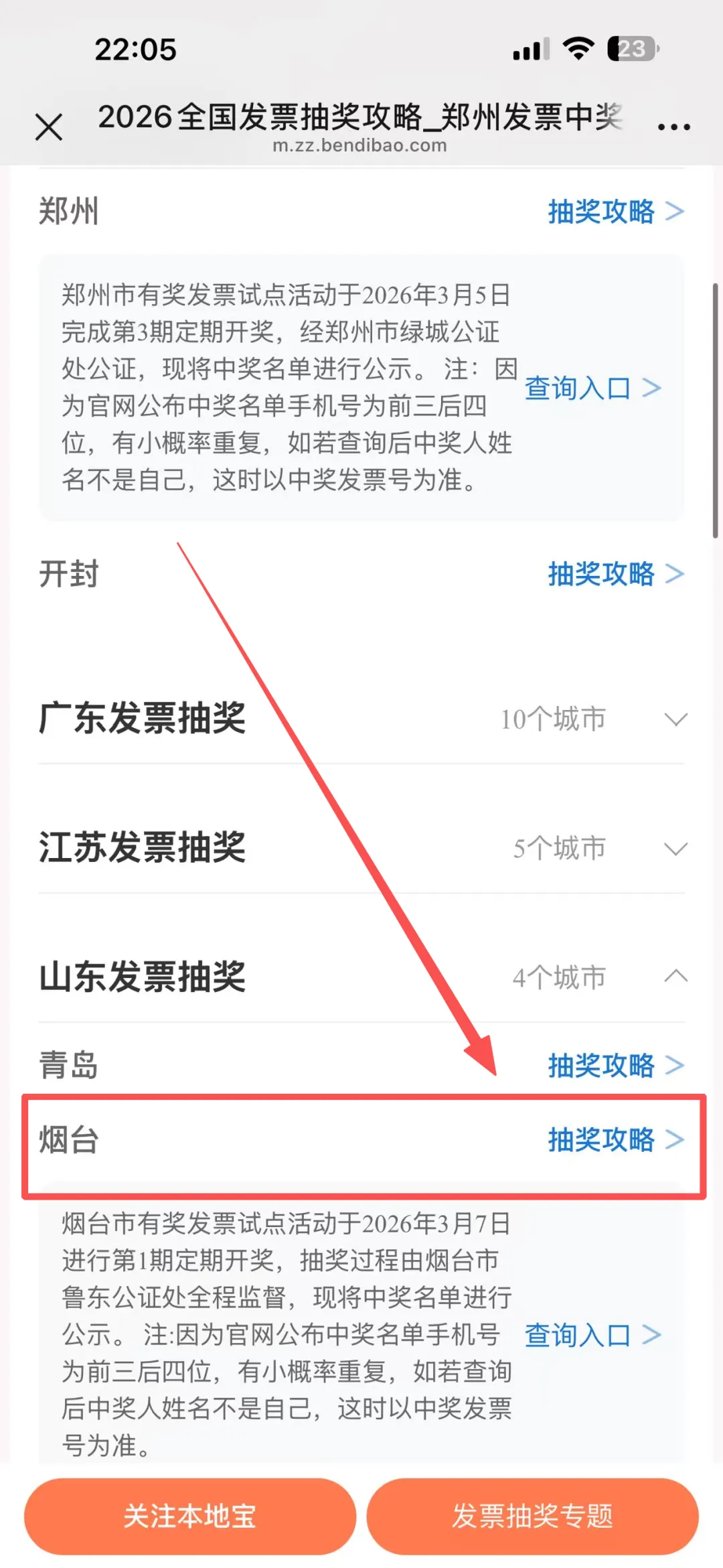 进入工具后找到【烟台】,点击进入就可以看到烟台哪些平台可以参与发票抽奖,以及对应平台的发票抽奖攻略,如果该城市有定期开奖的奖项,也可以一键获取烟台定期开奖的公示名单,无需再去翻找官方网站和账户!