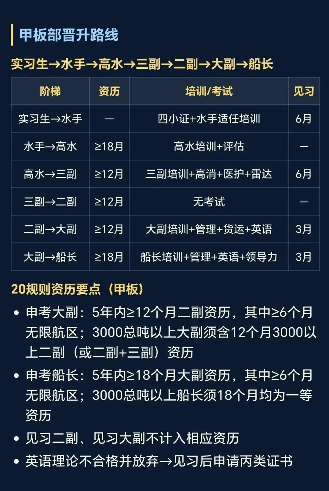 不同岗位,晋升的速度有所不同,通常需要通过适任考试和积累一定的海上服务资历。例如,三副晋升为二副通常需要至少12个月的相关工作经验 。