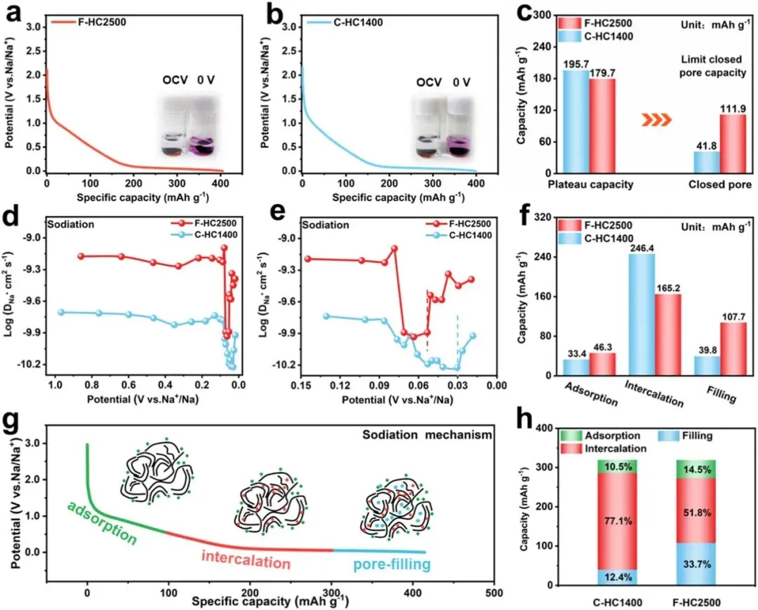 最后把容量全拆开(图6f-h):快烧样F-HC2500,吸附14.5%、嵌入51.8%、填充33.7%——三阶段均衡贡献。慢烧样C-HC1400,嵌入77.1%、填充12.4%——嵌入当家。