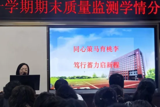 在本次学情分析会上,教学副校长魏军首先对初三年级及初一、初二年级全体教师的辛勤付出给予充分肯定与高度表扬;随后以精准数据为支撑,从横向、纵向对三个年级整体学情进行对比分析,并与市级考试整体情况对标,清晰展现出全体教师深耕教学后的显著成效,同时对优秀教师予以表扬;围绕教学提质,魏校长提出明确改进策略:强调加强团队协作、夯实基础、狠抓落实,坚持巧评价、善评价,实现学生分类分层推进;并号召全体教师“同心策马育桃李,笃行蓄力启新程”,紧跟教育改革方向,积极推动AI赋能课堂教学,以核心素养为根本目标,优化课程内容,全面提升学生学业质量。整场发言既有数据支撑,又有路径指引,为全校下一阶段教学工作明确了方向,凝聚了共识,提振了信心。