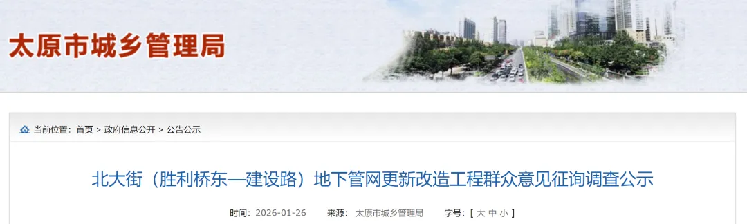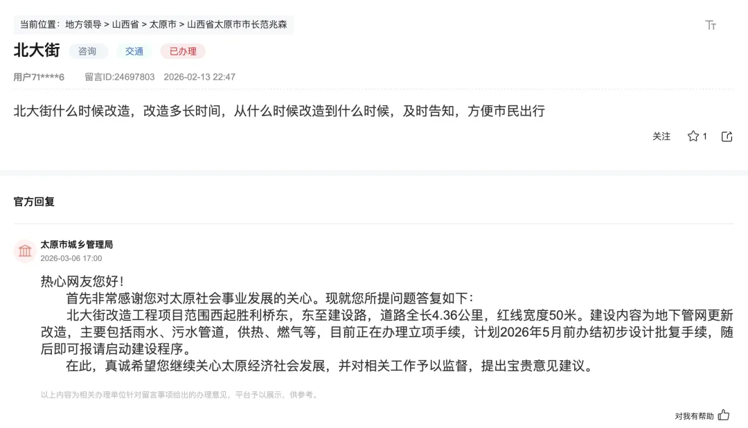 官方回复称:北大街改造工程项目范围西起胜利桥东,东至建设路,道路全长4.36公里,红线宽度50米。建设内容为地下管网更新改造,主要包括雨水、污水管道,供热、燃气等,目前正在办理立项手续,计划2026年5月前办结初步设计批复手续,随后即可报请启动建设程序。