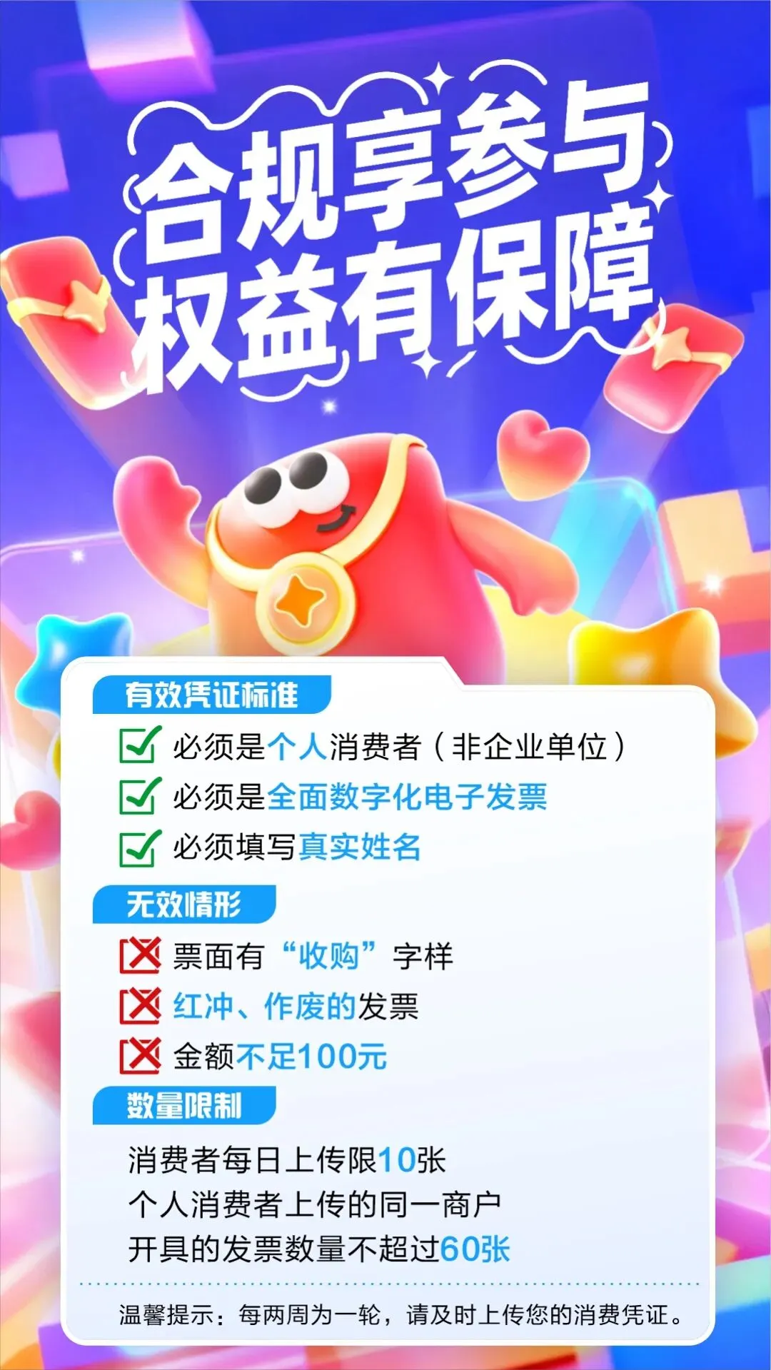 每张发票只能上传一次,个人消费者每天上传有效发票不要超过10张(全渠道累计);活动期间(共172天)同一消费者上传的同一商户开具的发票数量不超过60张,每人累计上传有效发票不超过150张。