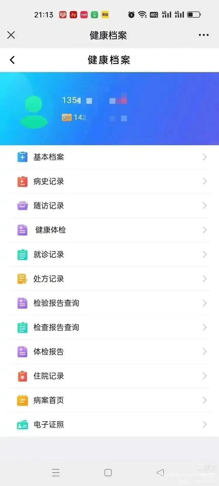 单击“电子档案”---选择“健康档案查询”,单击页面左上角的“健康档案”,即可打开“健康档案”界面,如下图所示: