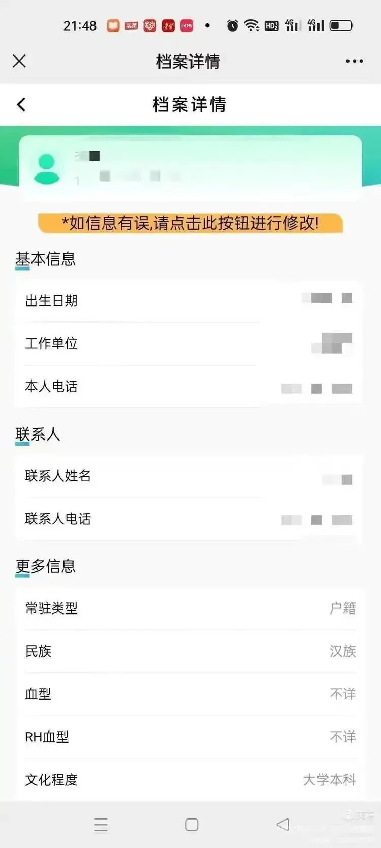 可以查看本人的基本档案信息,如下图所示: