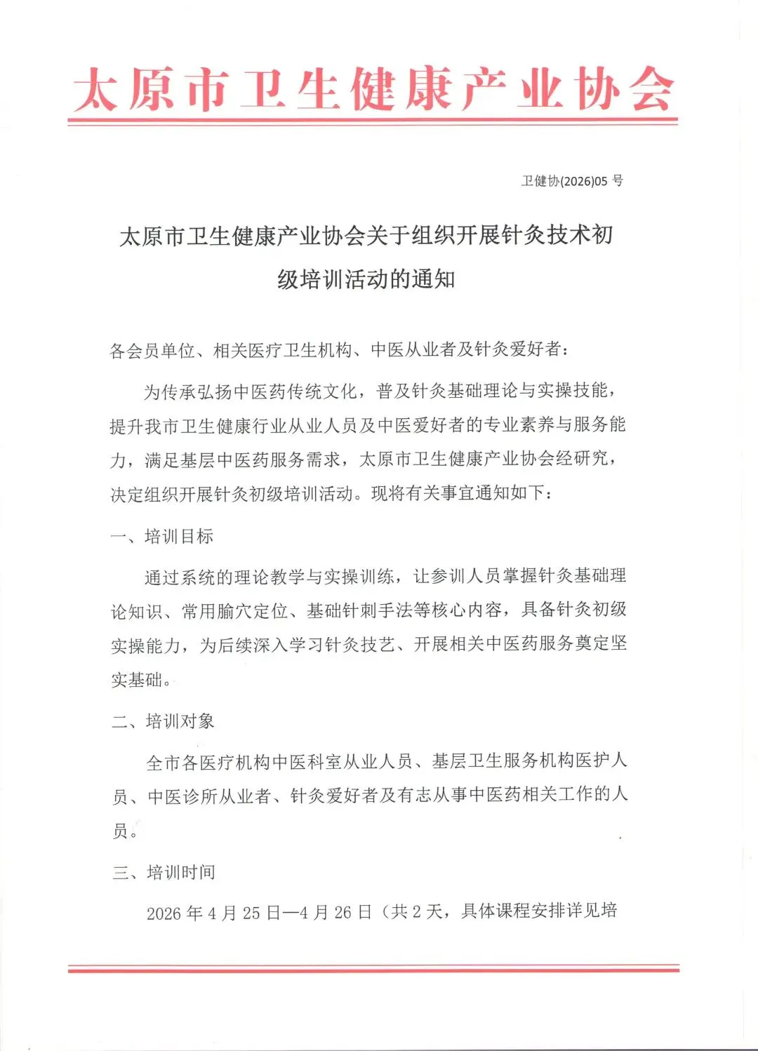 为传承弘扬中医药传统文化,普及针灸基础理论与实操技能,提升我市卫生健康行业从业人员及中医爱好者的专业素养与服务能力,满足基层中医药服务需求,太原市卫生健康产业协会经研究,决定组织开展针灸初级培训活动。现将有关事宜通知如下: