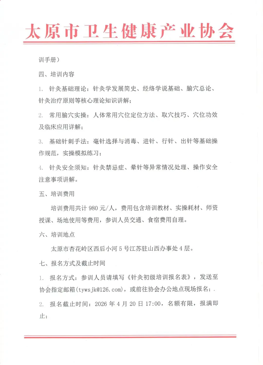 1. 报名方式:参训人员请填写《针灸初级培训报名表》,发送至协会指定邮箱(tywsjk@126.com),或前往协会办公地点现场报名;