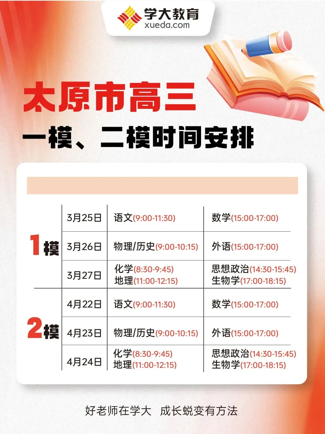 进入下学期,我们太原市2026年各类中、高考模拟考试将会陆续展开,根据往年的安排,初三年级有百校联考(一、二、三、四),太原市一、二模,山西省适应性考试等具有参考性的实战模拟演练试题;高三年级有太原市一、二模,山西省模拟等重要考试。以下是目前已知的初三百校一,高三太原市一、二模考试时间安排,同学和家长们提前关注了解~