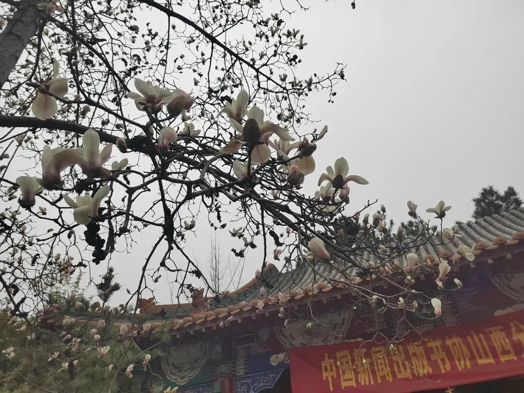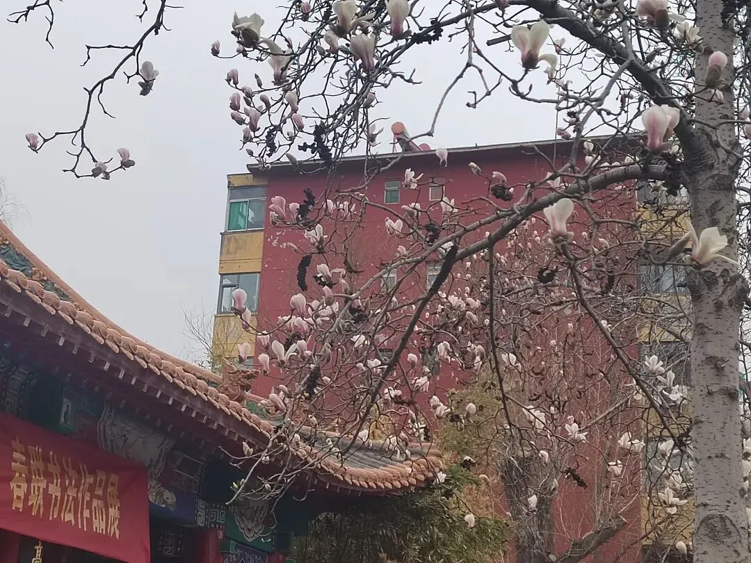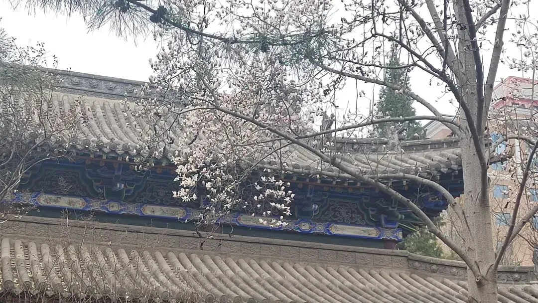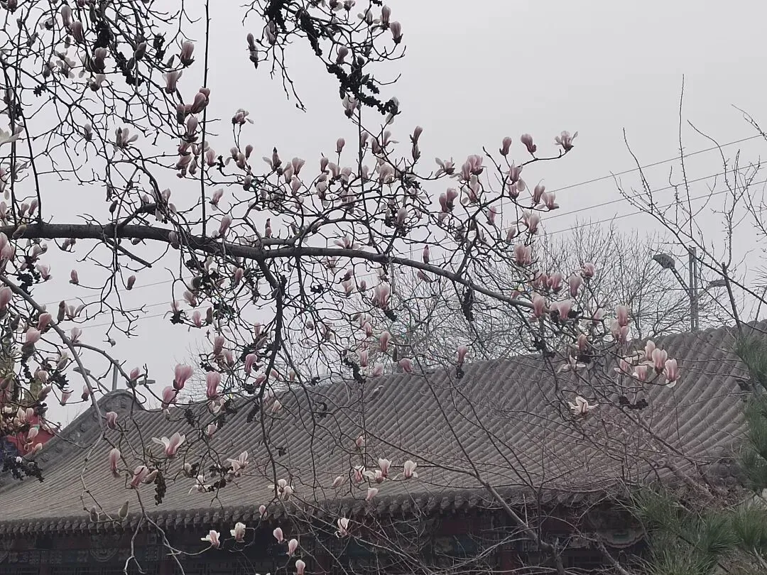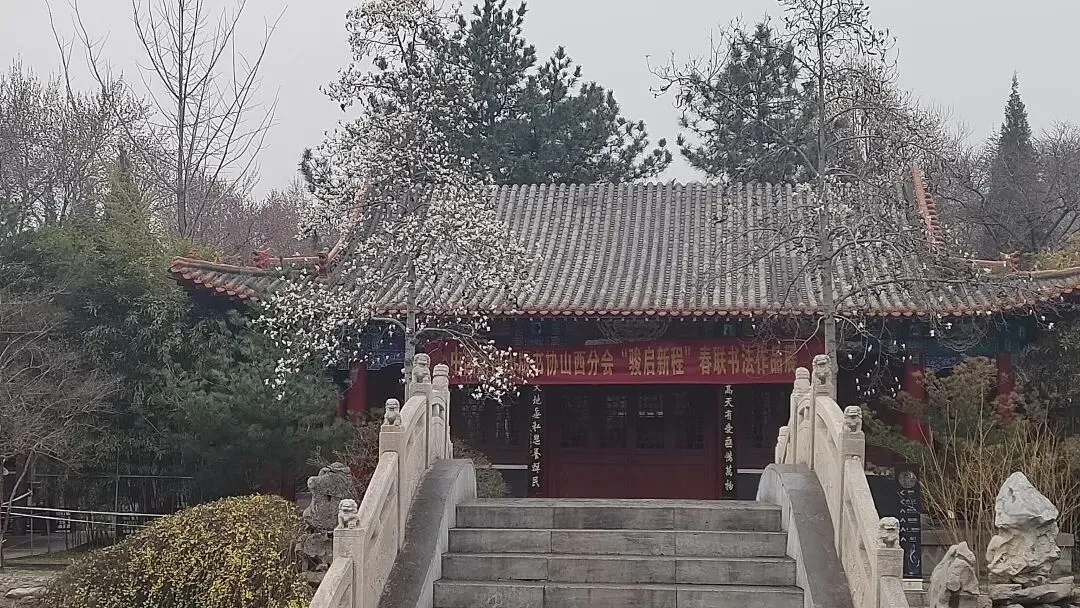灰瓦飞檐间,粉白的花影与墨色碑刻相映成趣,傅山先生的笔意还在石上流淌,枝头的春意已漫过古建的翘角,把三百年的文气,酿成了眼前这一场温柔的相逢!
