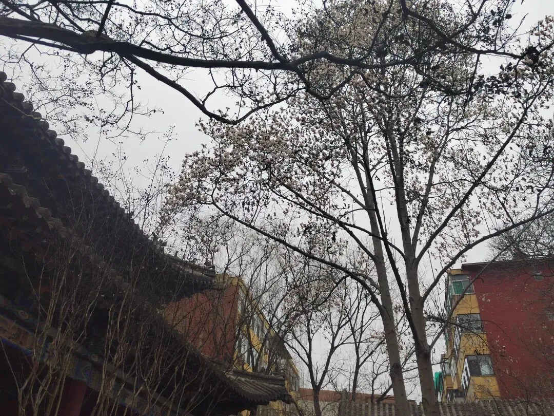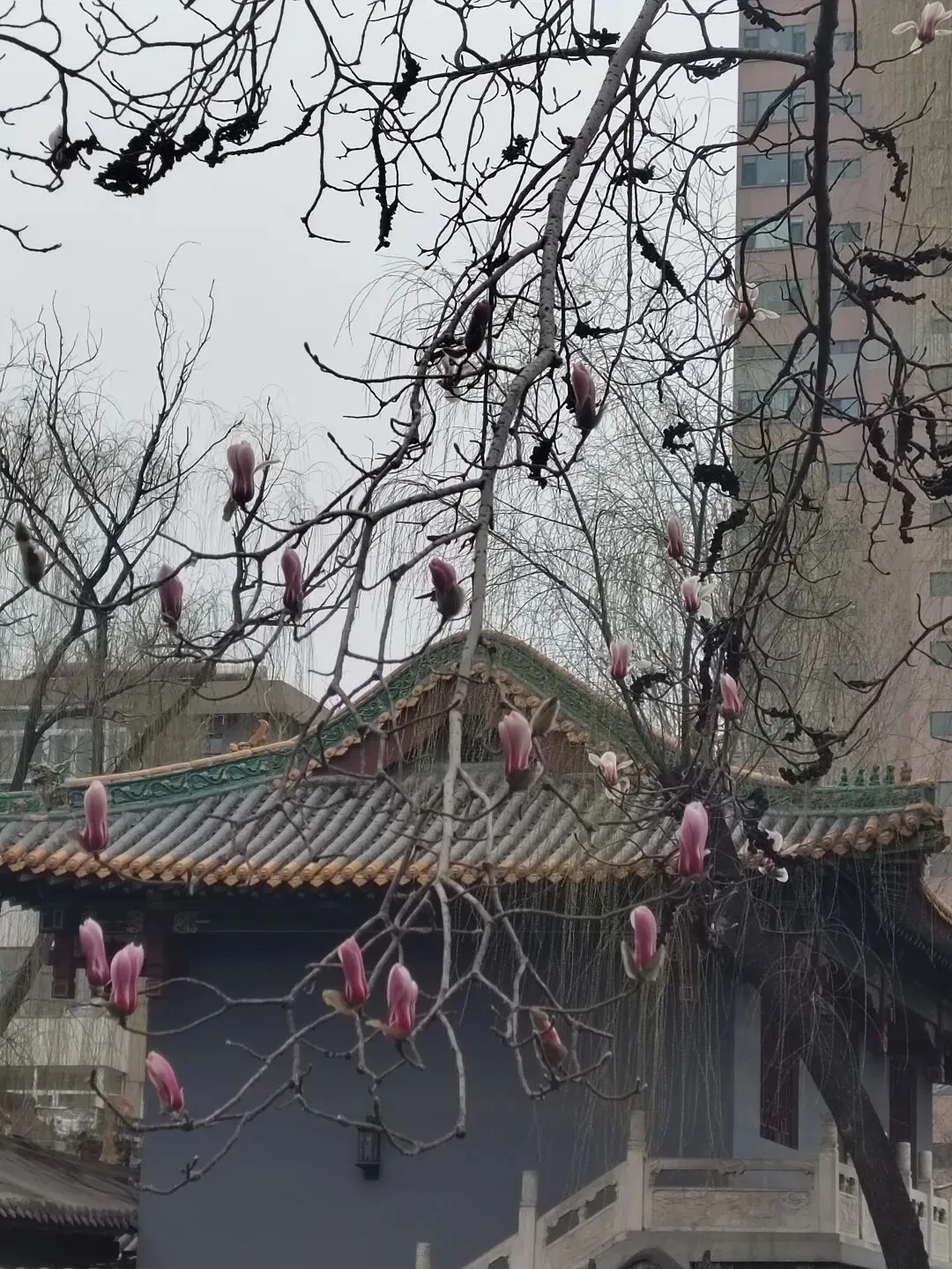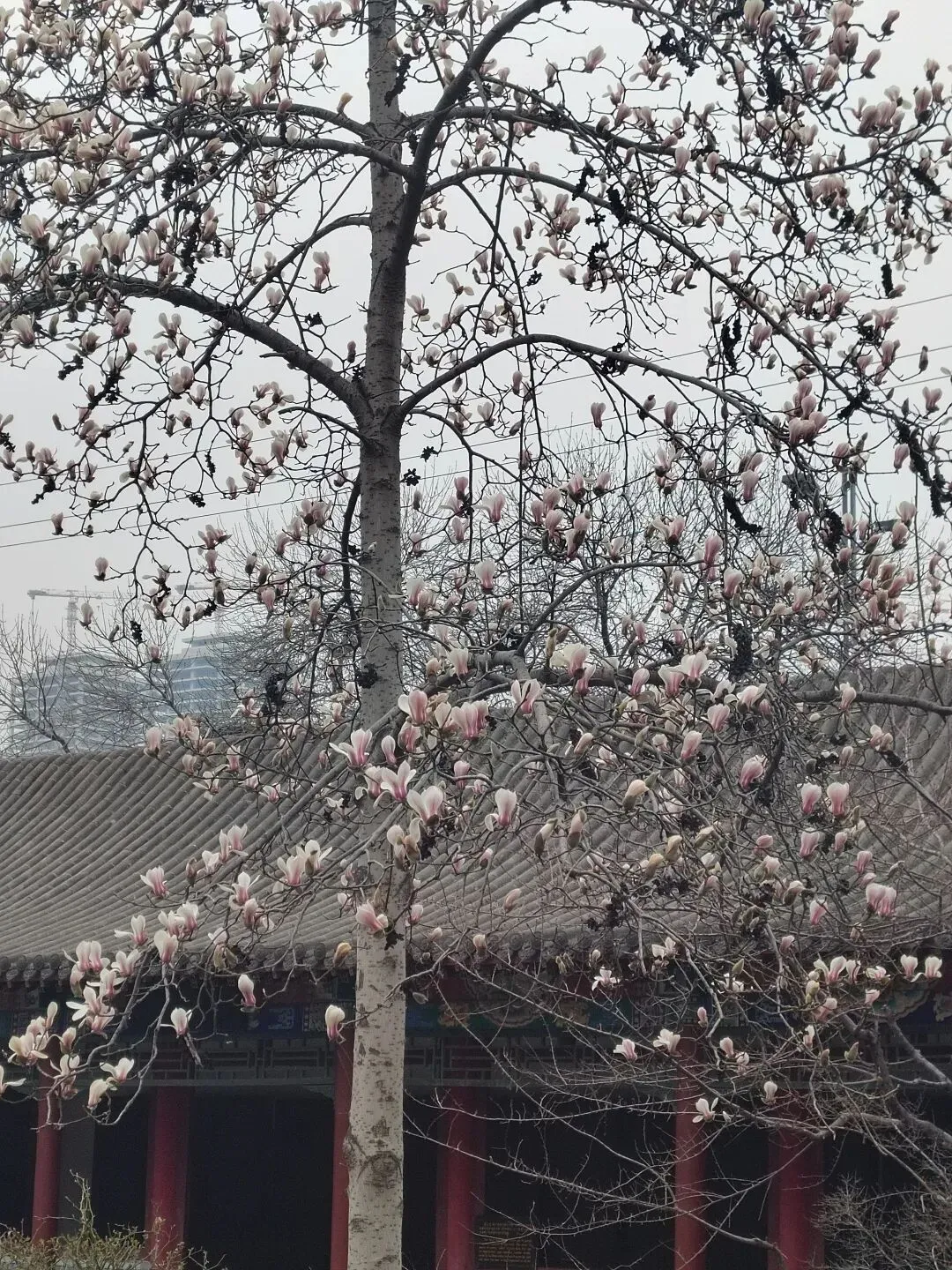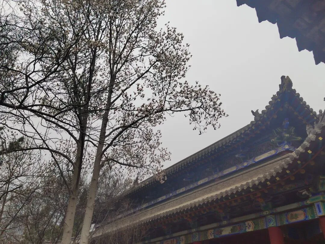 灰瓦飞檐间,粉白的花影与墨色碑刻相映成趣,傅山先生的笔意还在石上流淌,枝头的春意已漫过古建的翘角,把三百年的文气,酿成了眼前这一场温柔的相逢!