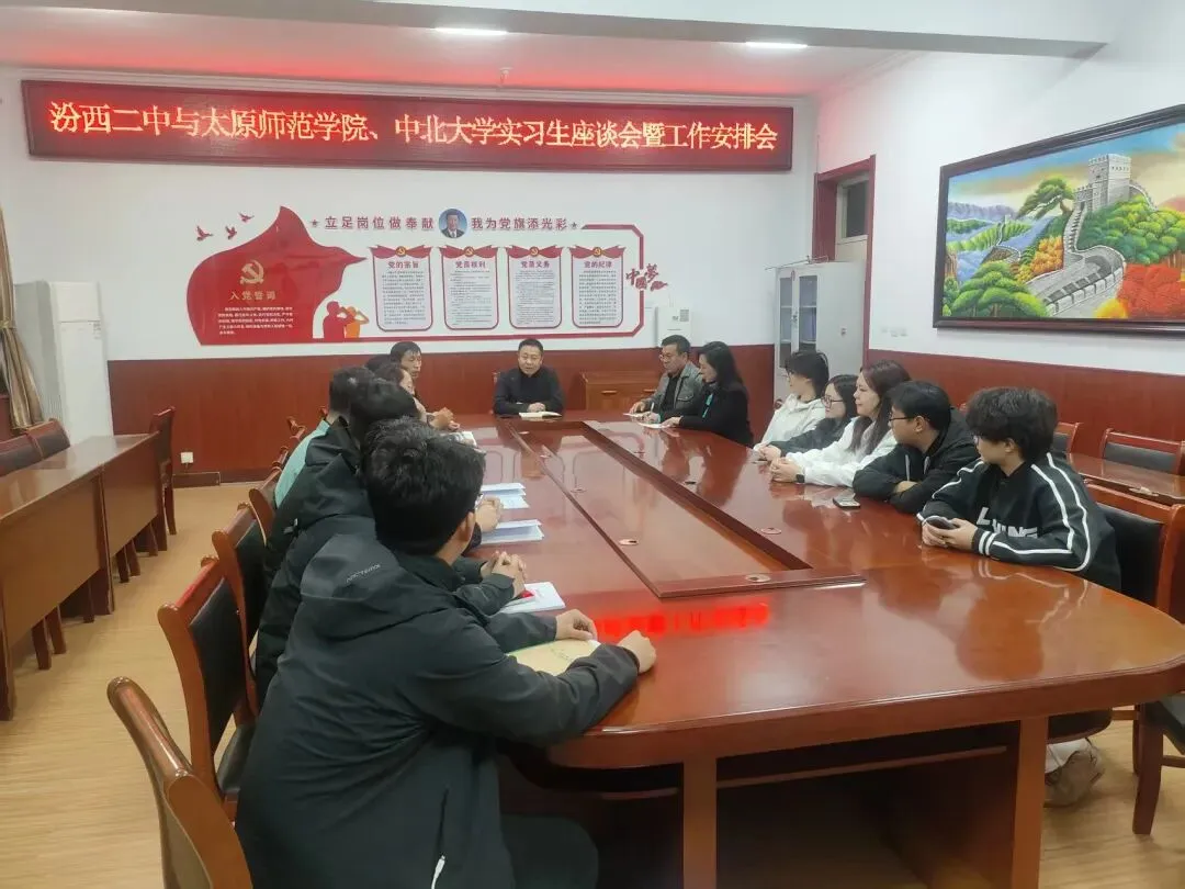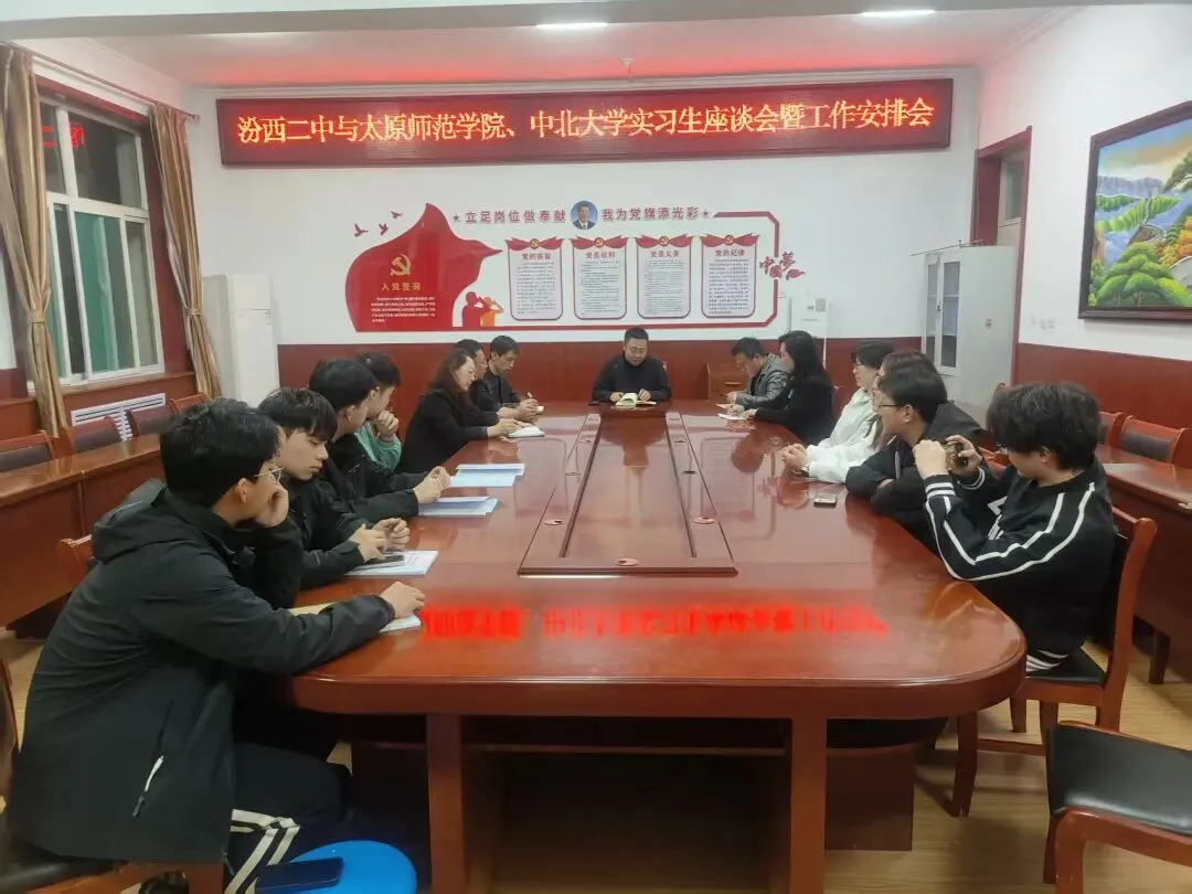 为保障实习工作有序开展,助力青年教师成长,2026年3月12日,汾西二中召开与太原师范学院、中北大学实习生座谈会暨工作安排会。郭安明校长及相关校领导、指导教师与全体实习生共同参会。