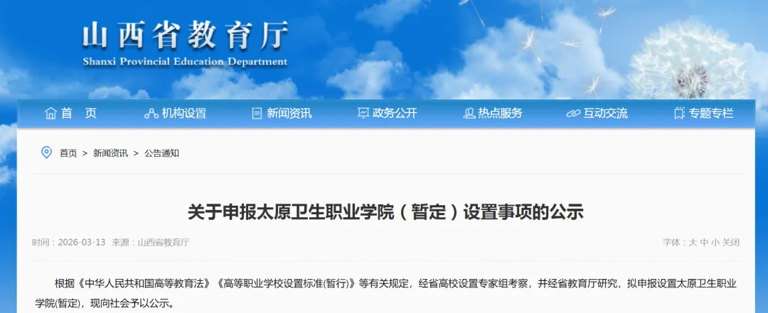 3月13日,山西省教育厅发布一则关于申报太原卫生职业学院(暂定)设置事项的公示信息。根据《中华人民共和国高等教育法》《高等职业学校设置标准(暂行)》等有关规定,经省高校设置专家组考察,并经省教育厅研究,拟申报设置太原卫生职业学院(暂定),现向社会予以公示。太原卫生职业学院(暂定)是位于山西省太原市尖草坪区柏板乡中北高新园区的一所筹建中的卫生职业学院,详细地址为镇城大街以南、公园南街以北、傅山园西路以东、康西路以西。该校由太原市委、市政府根据推进高质量教育的总体部署设立,旨在为健康山西、健康太原建设提供人才保障,全面提高医学人才培养质量。