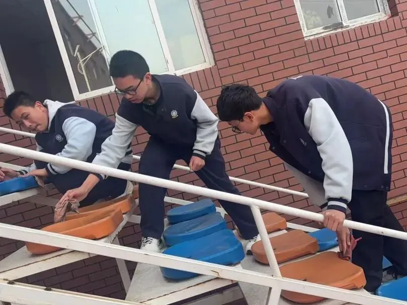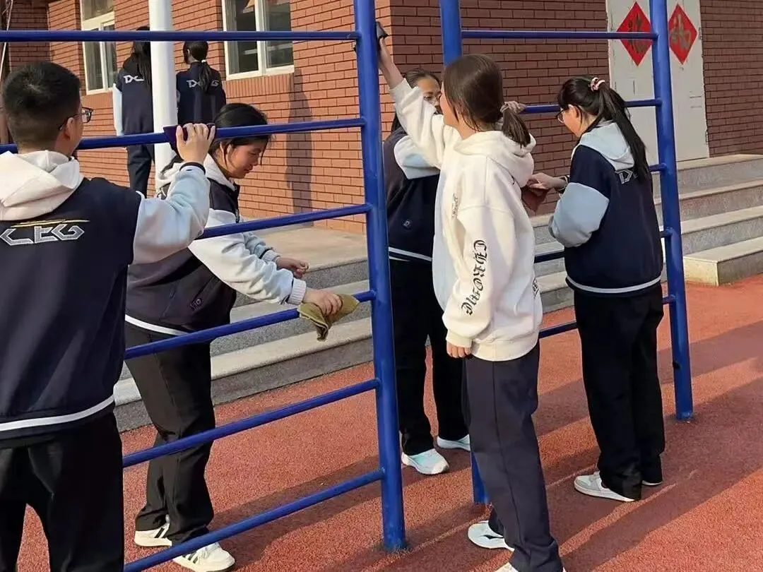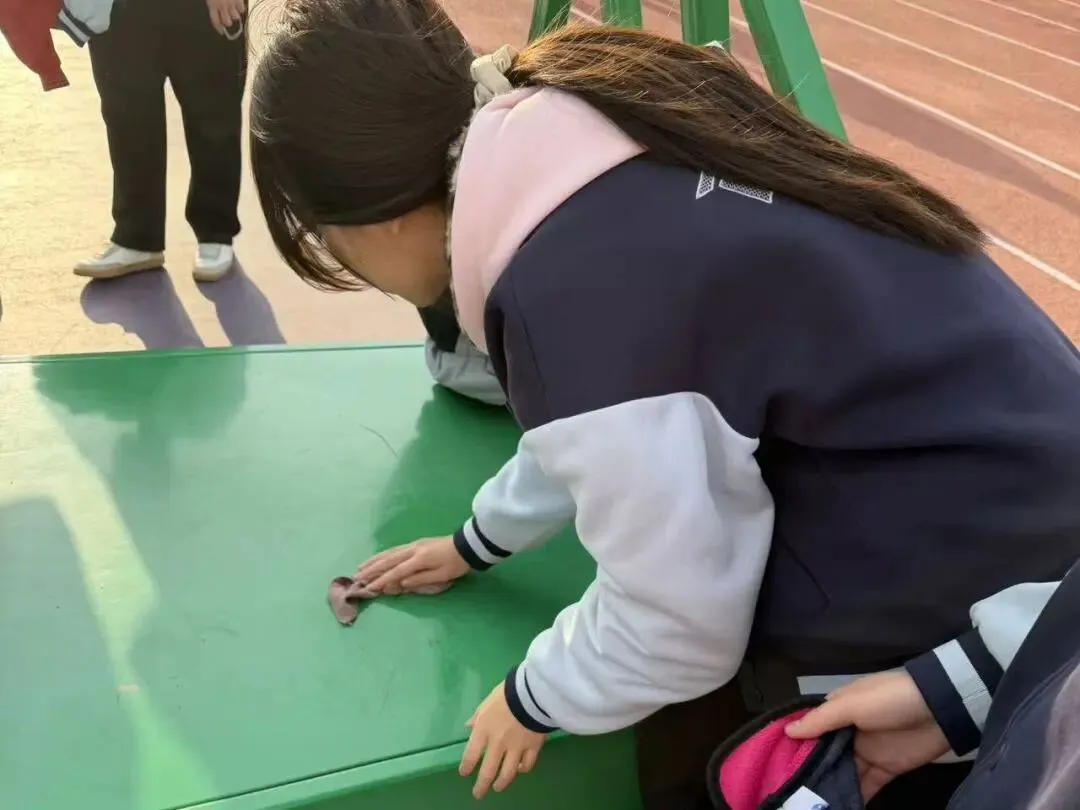 同学们认真擦拭篮球架、看台座椅及各类健身器材,彻底清扫纸屑、落叶等杂物。原本积灰的器材变得锃亮,运动场所更加整洁舒适,为师生们提供了安全舒心的锻炼环境。