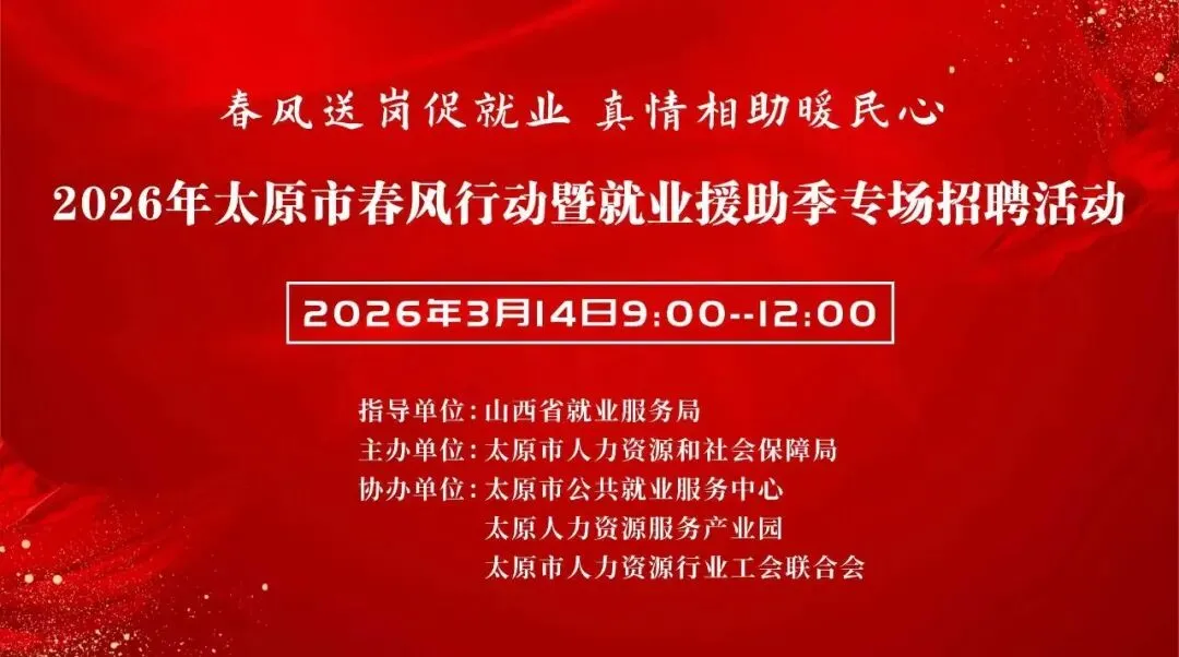 太原市公共就业服务中心定于2026年3月14日,在太原人力资源服务产业园持续举办春风行动暨就业援助季专场招聘会,助力企业精准揽才、劳动者安心求职。