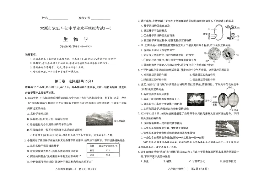 >【山西中考】2025年山西省太原市八年级一模生物试题分享