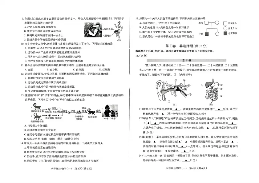 八年级生物:寒假复习精选卷山西八上期末试题分享