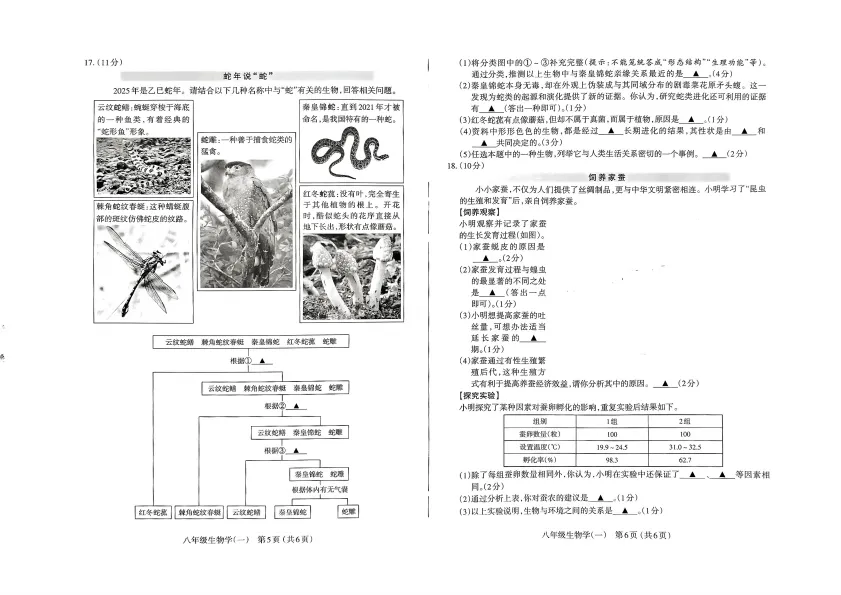 八年级生物:山西大同天镇县2025-2026学年八年级上学期期末试题分享