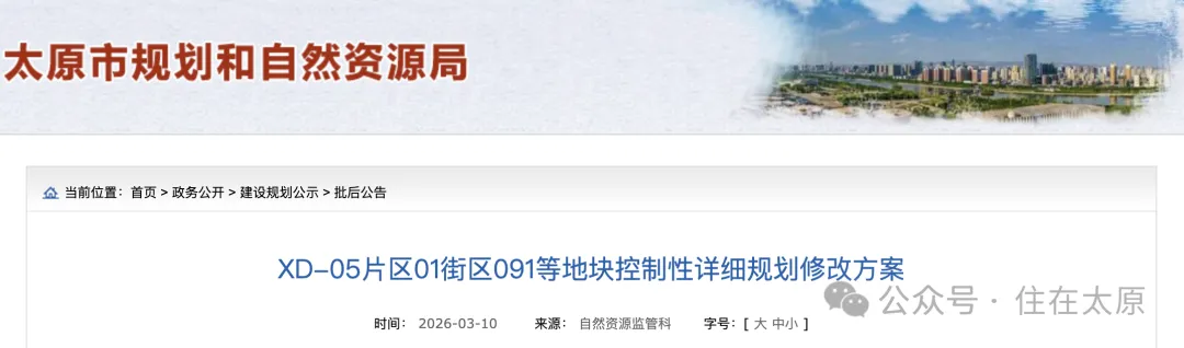 3月10日,太原市规划和自然资源局网站发布了XD-05片区01街区091等地块控制性详细规划修改方案,揭开了这一备受关注地块的详细参数。