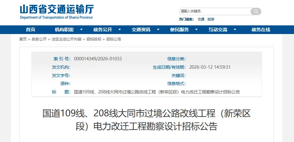国道109线、208线大同市过境公路改线工程(新荣区段)电力改迁工程勘察设计(招标项目编号:E14020000G3001821004),已由山西省发展和改革委员会关于国道109线、208线大同市过境公路改线工程可行性研究报告(代项目建议书)的批复(晋发改审批发【2024】326号)批准建设,初步设计已由山西省交通运输厅关于国道109线、208线大同市过境公路改线工程两阶段初步设计核准的批复(晋交审批发【2024】463号)批准,项目资金来源为政府资金(中央车购税)及社会资本方融资,招标人为大同市新荣区交通运输局。