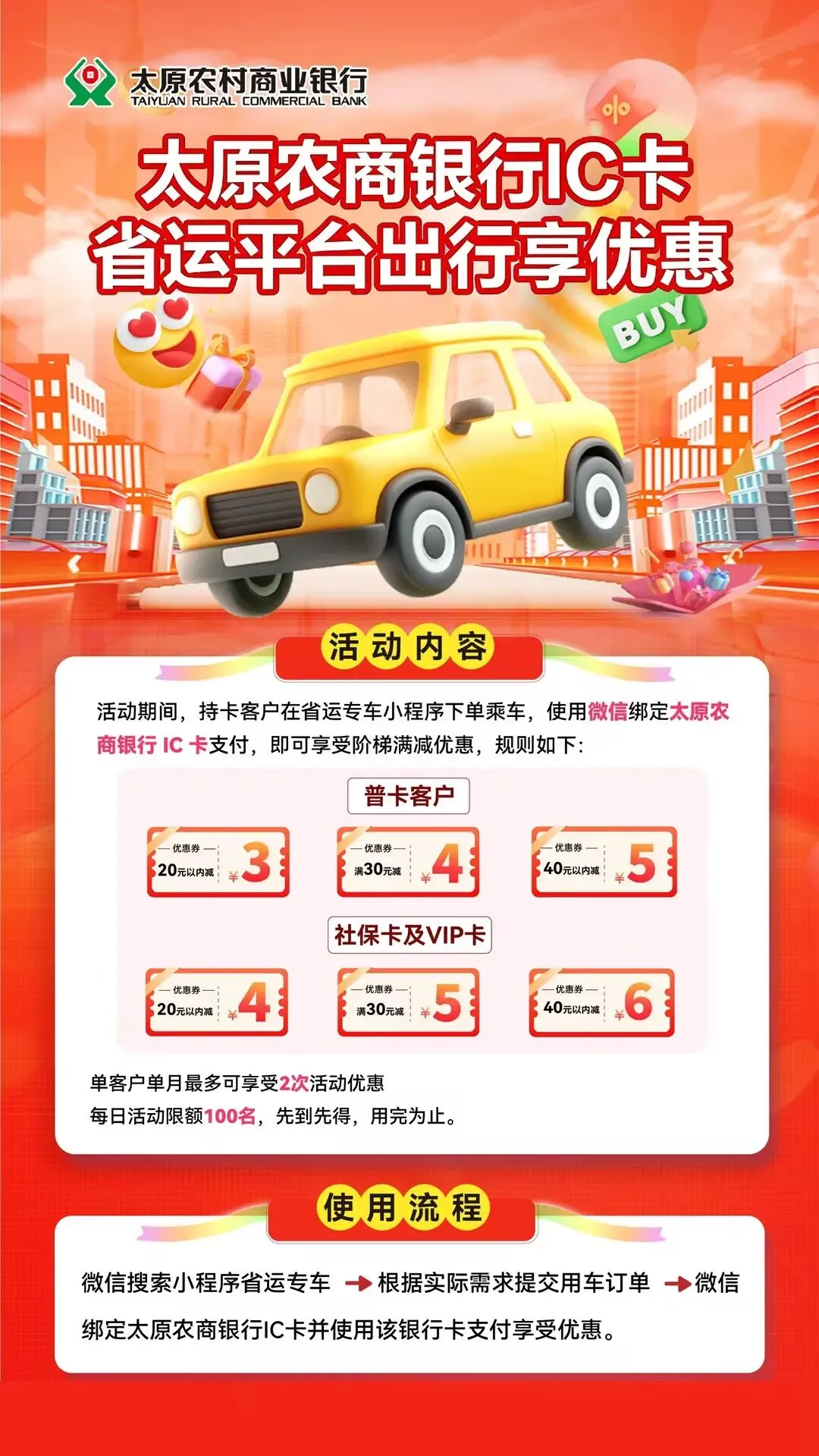 活动期间,太原农商银行持卡客户在省运专车微信小程序网约车平台乘车,使用微信绑定太原农商银行IC卡支付可享受满减优惠,普卡客户单笔20元以内减3元,满30元减4元,40元以上减5元;社保卡及VIP卡持卡客户单笔20元以内减4元,满30元减5元,40元以上减6元。单客户单月最多可享受2次活动优惠,每日活动限额100名,先到先得,用完为止。
