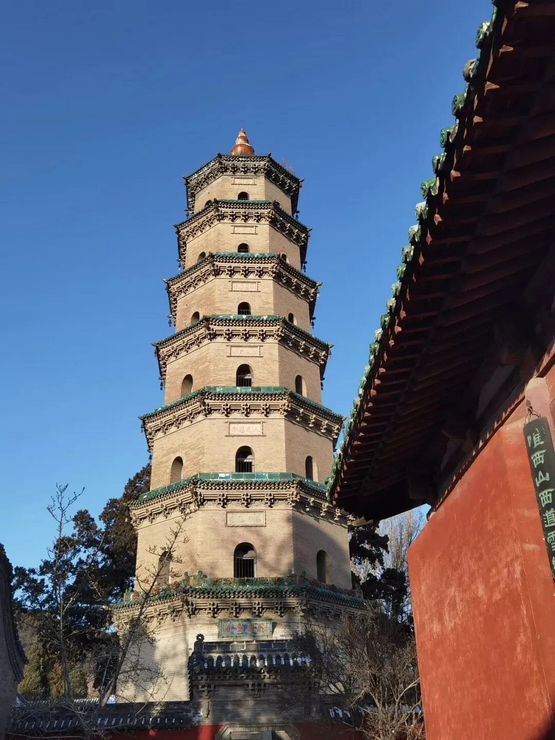 在圣母殿的北侧,有一株西周(公元前1046-前771年)初年所植、距今逾三千年的周柏,树皮已经皲裂斑驳,一看就是历经沧桑,树干已经倾斜,但却枝叶常青,静卧一旁,如苍龙欲飞。