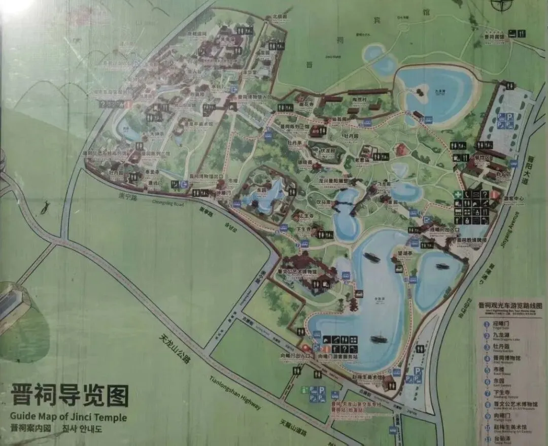 从晋祠博物馆入口进入,中轴线上依次是水镜台、金人台、献殿、鱼沼飞梁和圣母殿,中轴线右侧是唐叔虞祠、李世民《晋祠之铭并序》碑、关帝庙,中轴线左侧有水母楼、难老泉、胜瀛楼、傅山纪念馆、董寿平美术馆、唐刻华严石经陈列馆、奉圣寺等。