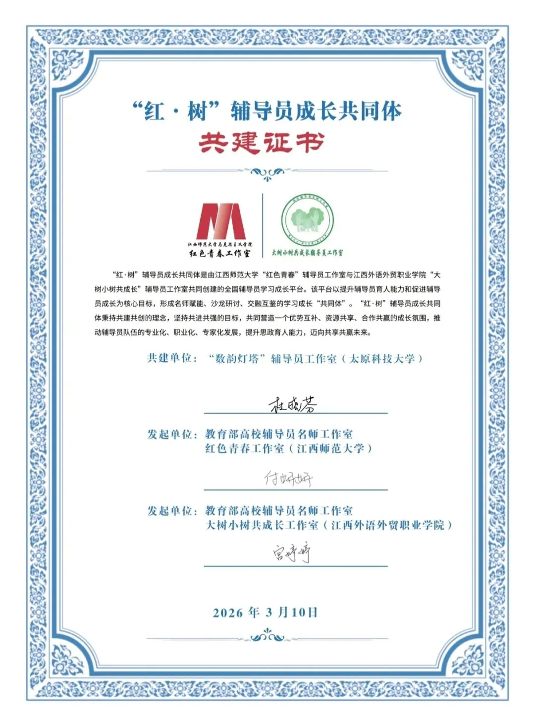 红·树”辅导员成长共同体作为全国高校辅导员协同育人的核心平台,凝聚多地域、多高校优秀辅导员工作室的力量,坚守“优势互补、资源共享、合作共赢”的初心,秉持“共建共创、共进共强”的理念,搭建起跨校、跨域、跨学科的辅导员专业成长共同体,为高校思政育人工作高质量发展注入了澎湃动力。此次太原科技大学“数韵灯塔”辅导员工作室成功加入共同体,成为共建单位,既为自身发展拓展了广阔的交流合作空间,也激励工作室在辅导员队伍专业化、职业化、专家化建设与思政育人品牌塑造的征程上勇毅笃行、再启新篇。