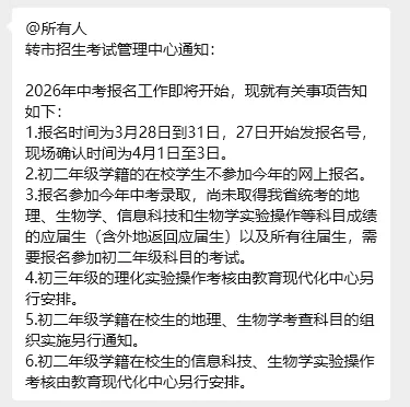 根据山西省招生考试管理中心《关于做好2026年初中学业水平考试工作的通知》(晋招考中〔2026〕1号)、临汾市教育局关于印发《临汾市初中学业水平考试调整事项实施方案》的通知(临教〔2025〕2号)文件精神,结合我市实际,现就我市2026年初中学业水平考试(以下简称“中考”)报名有关事项通知如下: