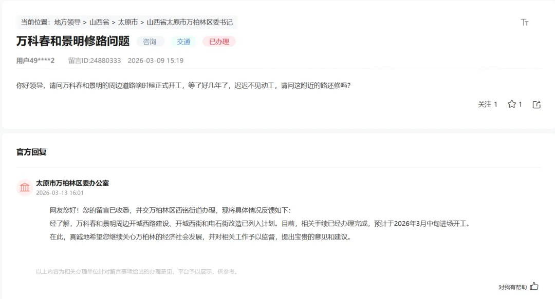 近日有网友在领导留言板提问:请问万科春和景明的周边道路啥时候正式开工,等了好几年了,迟迟不见动工,请问这附近的路还修吗?