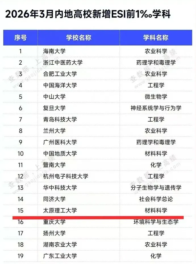 3月12日,全球权威专业信息服务提供商科睿唯安(Clarivate Analytics)发布2026年3月版《基本科学指标数据库》(Essential Science Indicators,简称ESI)最新统计结果。太原理工大学学科建设迎来里程碑式重大突破:材料科学学科首次跻身ESI全球排名前1‰,正式迈入国际顶尖学科行列,至此,该校ESI全球前1‰学科增至2个;计算机科学学科首次跻身ESI全球前1%,学科建设版图再添重要增长极,学校国际学术影响力与核心竞争力实现跨越式提升。