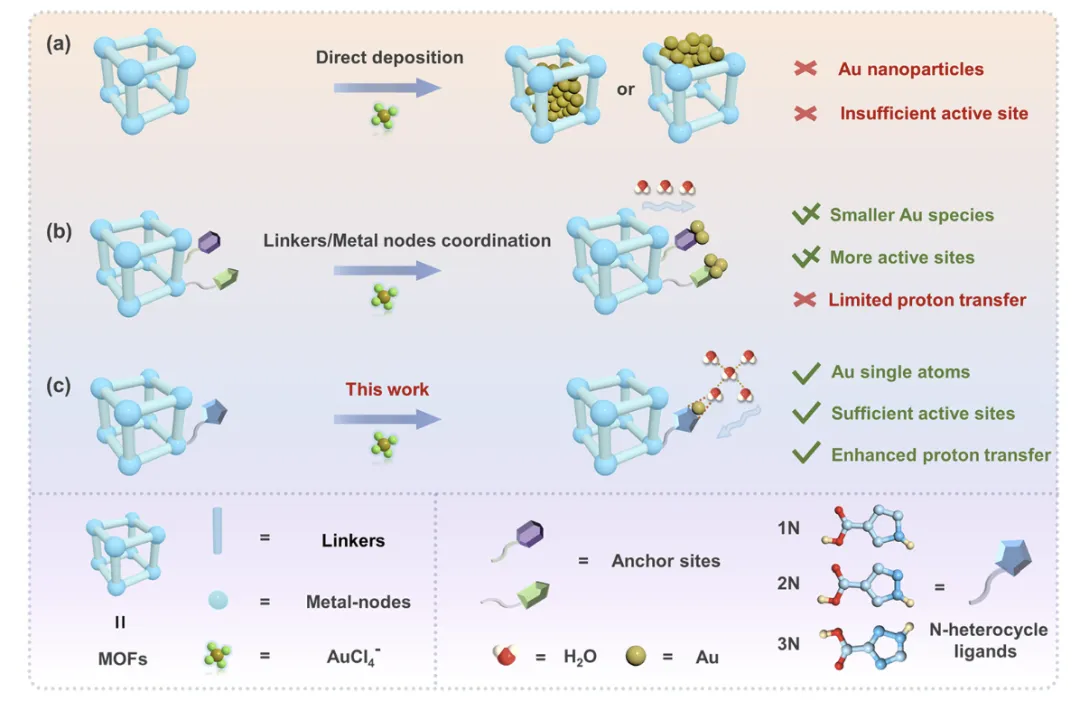 图 1. 催化剂与金属有机框架(MOF)集成的示意图:(a) 直接沉积法,(b) 配体后修饰法,(c) 本工作中提出的氮杂环配体接枝策略。