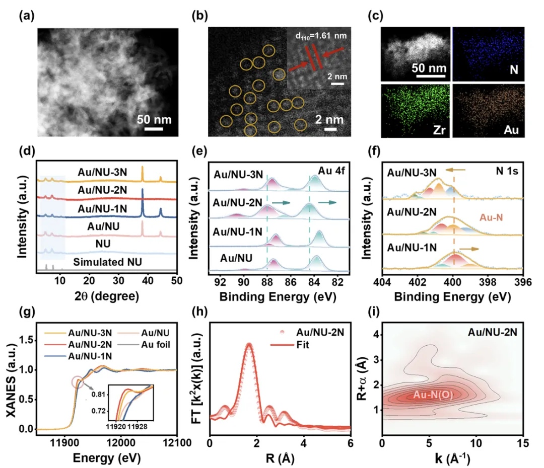 图 2. (a,b) Au/NU-2N 的高角环形暗场扫描透射电镜(HAADF-STEM)图像(橙色圆圈代表 Au 单原子)及 (c) 元素分布图。(d) 模拟 NU、NU、Au/NU、Au/NU-1N、Au/NU-2N 及 Au/NU-3N 的 HOMO 图案。(e) Au/NU、Au/NU-1N、Au/NU-2N 及 Au/NU-3N 的 Au 4f X 射线光电子能谱(XPS)。(f) Au/NU-1N、Au/NU-2N 及 Au/NU-3N 的 N 1s XPS 谱。(g) Au 箔、Au/NU、Au/NU-1N、Au/NU-2N 及 Au/NU-3N 的 Au L₃边 X 射线吸收近边结构(XANES)谱。(h) Au/NU-2N 的 Au L₃边扩展 X 射线吸收精细结构(EXAFS)谱及其拟合曲线。(i) Au/NU-2N 的 Au L₃边小波变换(WT-EXAFS)图。