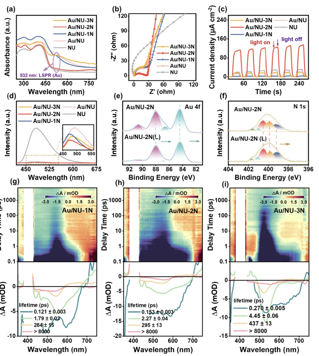 图 4. (a) NU、Au/NU、Au/NU-1N、Au/NU-2N 及 Au/NU-3N 的紫外 - 可见漫反射光谱(UV-vis DRS)、(b) 电化学阻抗谱(EIS)、(c) 瞬态光电流响应及 (d) 稳态光致发光(PL)谱。光照前后 Au/NU-2N 的 (e) Au 4f 及 (f) N 1s XPS 谱。(g) Au/NU-1N、(h) Au/NU-2N 及 (i) Au/NU-3N 在水中经 400 nm 激发后,于 442–700 nm 光谱窗口、8 ns 时间范围内监测的飞秒瞬态吸收(TA)谱。