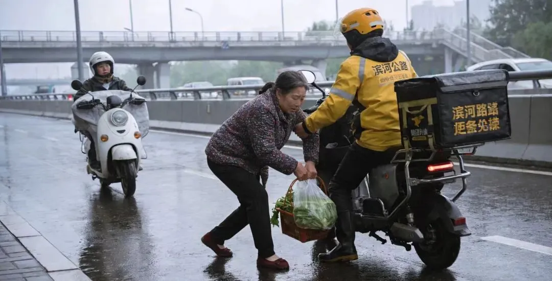 送单途中,路面已经开始泛湿滑,过滨河东路天桥时,他特意放慢速度,看到一位阿姨拎着菜篮差点滑倒,赶紧停下车扶了一把。阿姨笑着递给他一颗热乎的煮鸡蛋:“小伙子,雨雪天慢点走,注意安全。”