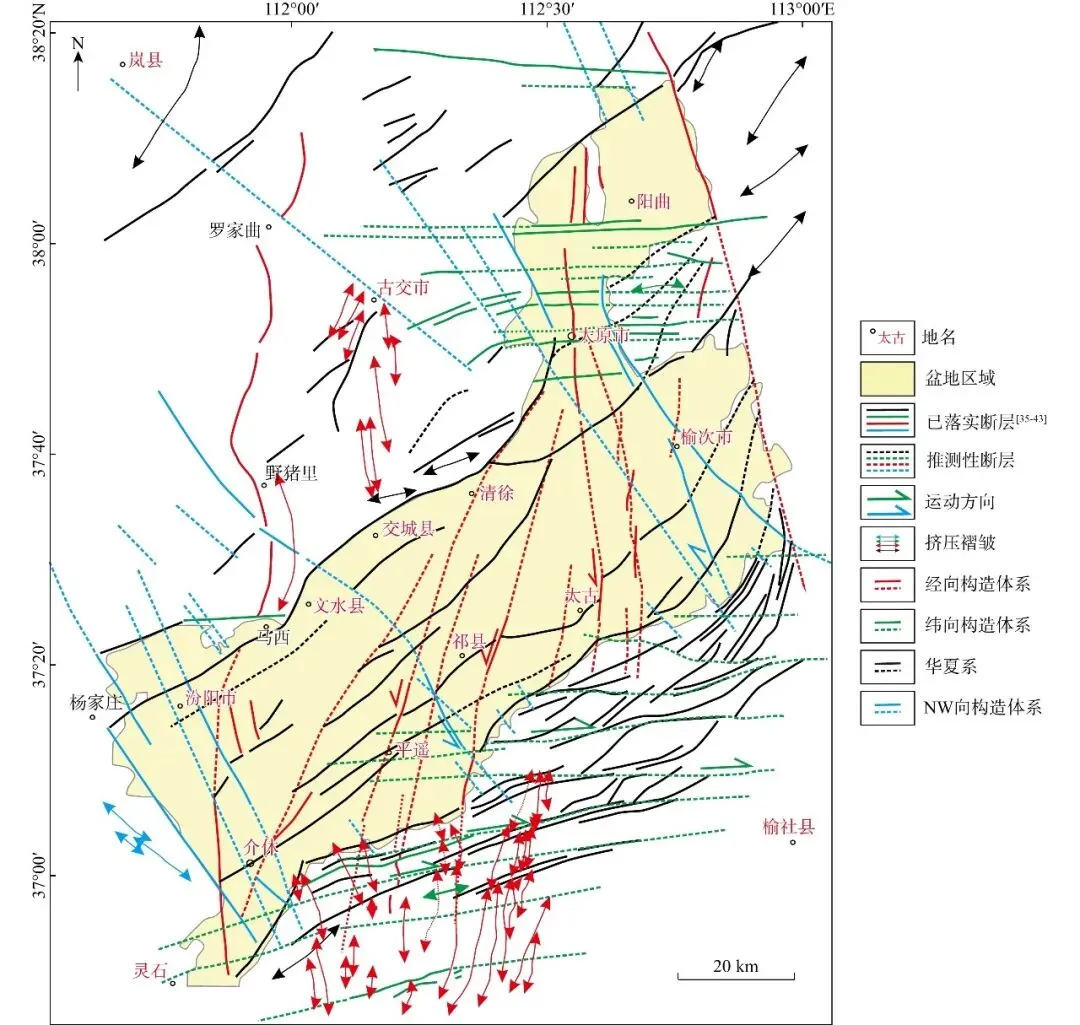 (4)太原盆地属于复杂断块控制的断陷盆地,盆地伸展以NE向构造体系的NW-SE向伸展行为为主,NE向构造体系既提供了成盆早期最重要的NE向构造线作为物质基础,也是最大范围影响成盆运动的模式,但成盆模式上并不是单一的NE向或者NNE向构造制约的NW-SE向伸展,而是各类成盆主控模式复杂的综合性模式,是多模式参与的复杂多变的多因成盆模式。